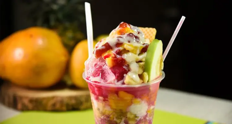 Un refrescante postre típico caleño hecho con una base de hielo raspado, frutas frescas, leche condensada, jarabes de colores, y coronado con una cereza y obleas. Perfecto para combatir el calor y disfrutar de un dulce tropical.